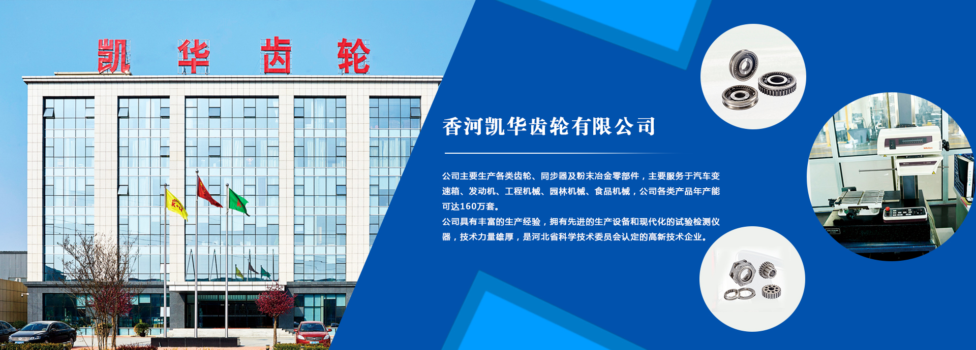 香河凱華齒輪有限公司是一家民營(yíng)企業(yè),位于香河經(jīng)濟(jì)開(kāi)發(fā)區(qū),毗鄰京津,交通便利。公司占地面積7萬(wàn)平米,注冊(cè)資本1360萬(wàn)元,現(xiàn)有員工400余人,其中技術(shù)質(zhì)量工程人員70余名,擁有中高級(jí)職稱人員30余名。公司主要生產(chǎn)各類齒輪、同步器及粉末冶金零部件,主要適配汽車變速箱與發(fā)動(dòng)機(jī),公司各類產(chǎn)品年產(chǎn)能可達(dá)160萬(wàn)套。